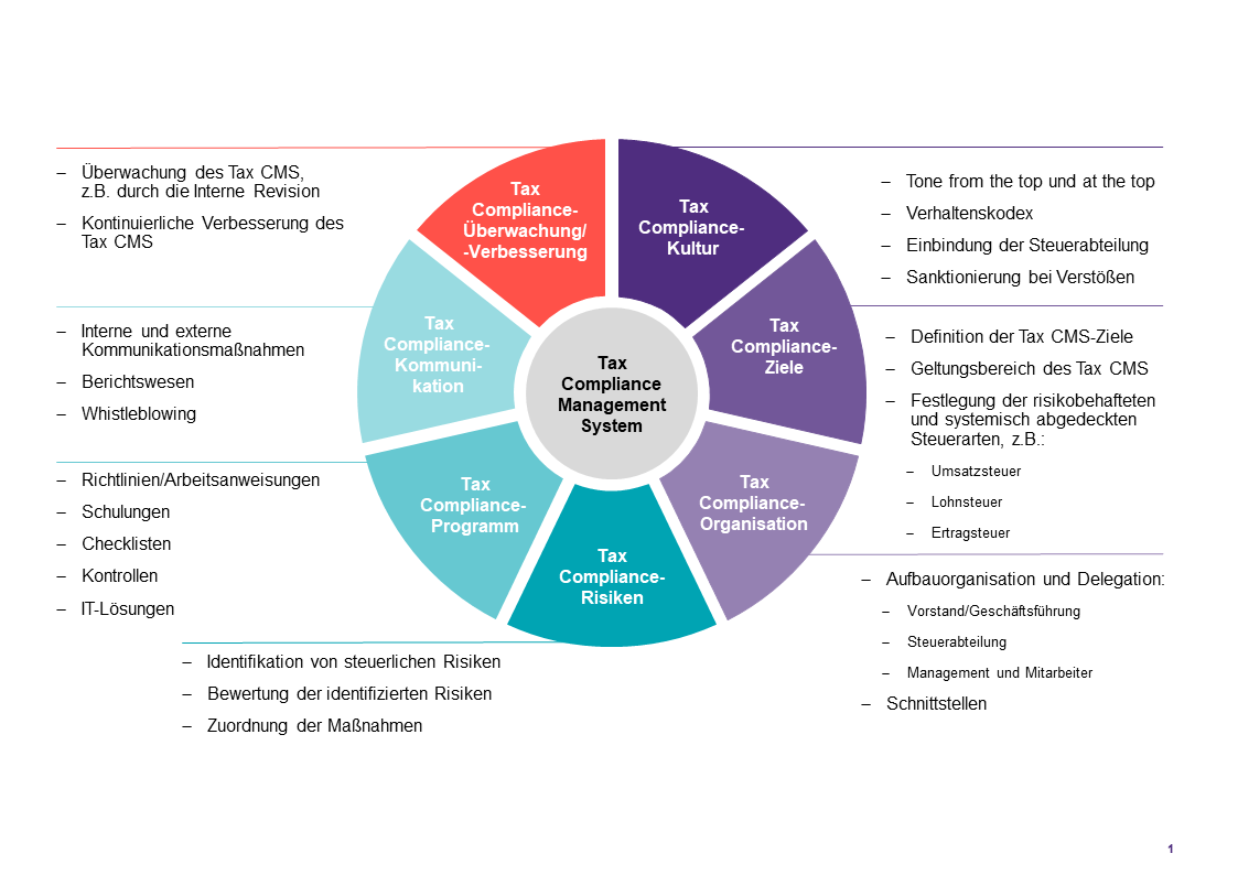 „Ein Steuerkontrollsystem umfasst alle innerbetrieblichen Maßnahmen, die gewährleisten, dass (i) die Besteuerungsgrundlagen zutreffend aufgezeichnet und berücksichtigt werden sowie (ii) die hierauf entfallenden Steuern fristgerecht und vollständig abgeführt werden“ (Artikel 97 § 38 EGAO). Das Steuerkontrollsystem muss ferner „die steuerlichen Risiken laufend abbilden“ und Veränderungen des Tax CMS müssen dokumentiert und unverzüglich gemeldet werden.